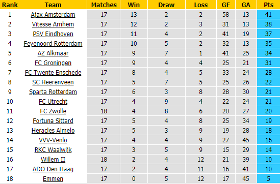 BẢNG XẾP HẠNG GIẢI VĐQG HÀ LAN