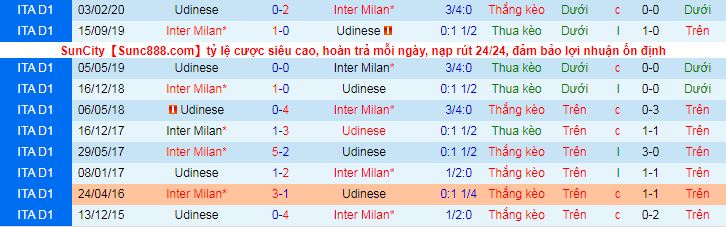 + Lịch sử đối đầu Udinese vs Inter