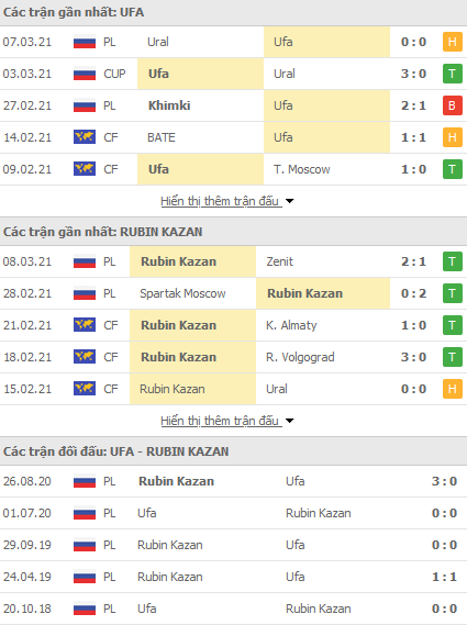 Phong độ và thống kê đối đầu gần đây Ufa vs Rubin Kazan: