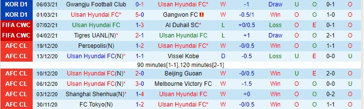 + Thống kê 10 trận gần nhất của Ulsan Hyundai