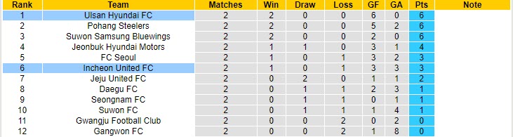 Bảng xếp hạng VĐQG Hàn Quốc vòng 2