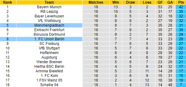 Trên sân nhà, Union Berlin bất bại 9 trên 10 trận gần đây tính trên mọi đấu trường. Xa hơn, 19 trận tiếp khách trước đó họ không thua 16 lần với 10 chiến thắng và 6 trận hoà. Bên kia chiến tuyến, niềm tin mà M'gladbach tạo ra trên sân khách là không cao. 7 trận xa nhà vừa qua, M'gladbach để mất điểm 5 lần với 3 thất bại và 2 trận hoà.
