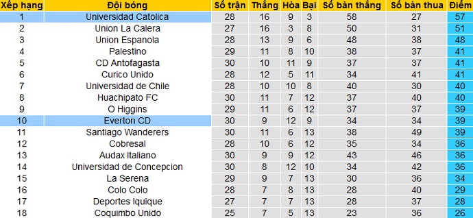 Bảng xếp hạng giải VĐQG Chile trước vòng 31