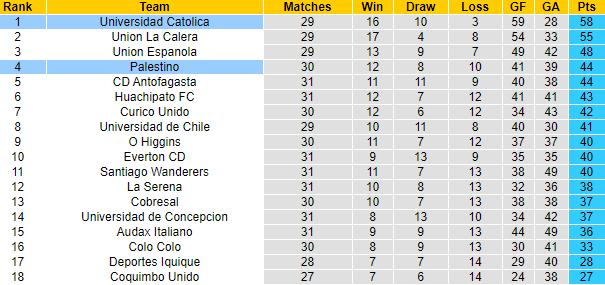 Phía đối diện, Palestino cũng đang có mặt ở vị trí thứ 4 nhưng kém nhiều điểm so với top 2. Ưu tiên hàng đầu với Palestino lúc này là giữ vững thứ hạng trong top 4 để có suất dự sơ loại Copa Libertadores, chính là Cúp C1 Nam Mỹ. Nên nhớ là phía sau Palestino, các đối thủ cũng không kém họ là bao về điểm số.
