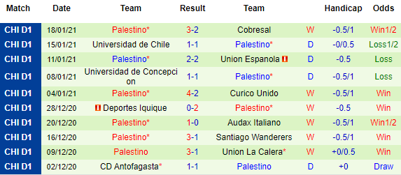 + Thống kê 10 trận gần nhất của Palestino