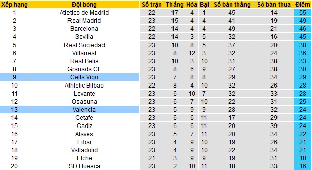Trong khi đó Celta Vigo cũng chỉ đang đứng thứ 9 trên bảng xếp hạng với 29 điểm sau 23 vòng đấu. Khoảng cách của Celta Vigo đến nhóm các đội có suất dự cúp châu Âu hiện cũng đang lên tới 7 điểm.