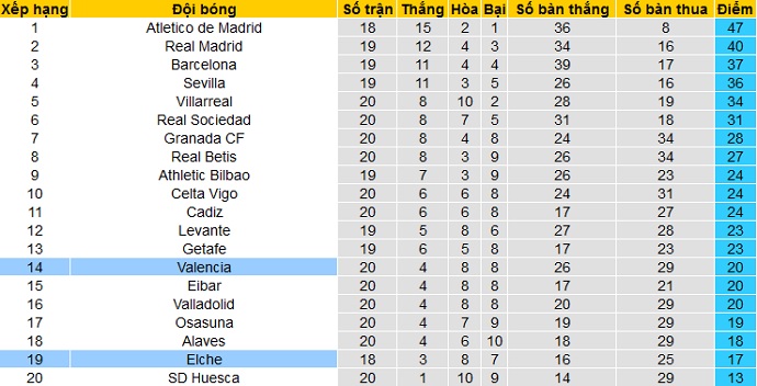Hy vọng có suất dự cúp châu Âu ngày càng trở nên xa vời với các cầu thủ Valencia khi hiện tại đội bóng chỉ đứng thứ 14 trên bảng xếp hạng La Liga với 20 điểm sau 20 vòng đấu. Không chỉ kém các đội Top 6 tới 11 điểm, Valencia giờ chỉ còn hơn nhóm các đội cầm đèn đỏ có 2 điểm và nguy cơ tụt hạng có thể đến bất kỳ lúc nào.