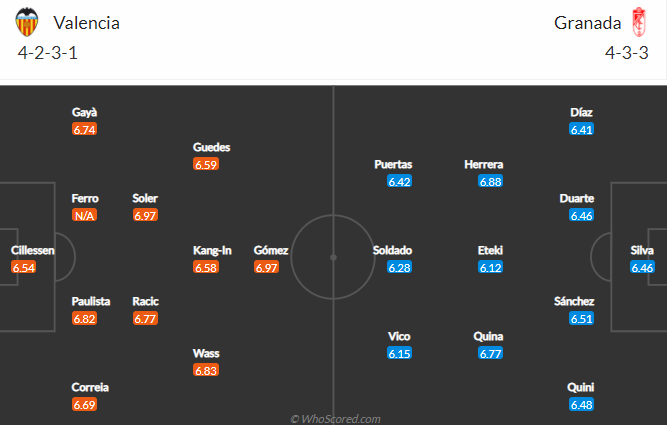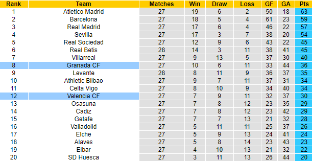 Trên sân khách, Granada thi đấu không tốt, 5 trận xa nhà gần đây họ thua 4, hòa 1. Gặp bất lợi về lịch thi đấu, chuyến hành quân đến Valencia sắp tới của Granada sớm được dự đoán lành ít dữ nhiều. Valencia lúc này đang cho thấy khả năng tận dụng rất tốt lợi thế sân nhà.