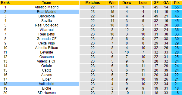 Dù vậy thì cơ hội thoát hiểm với Valladolid vẫn rộng mở khi họ chỉ kém vị trí an toàn phía trên ở chỉ số phụ. Bên kia chiến tuyến, Real Madrid cũng gặp khó khăn trên con đường bảo vệ chức vô địch. Họ hiện đứng thứ 2, kém đội dẫn đầu Atletico Madrid tới 6 điểm nhưng lại đá nhiều hơn 2 trận.