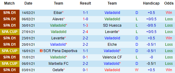 + Thống kê 10 trận gần nhất của Valladolid