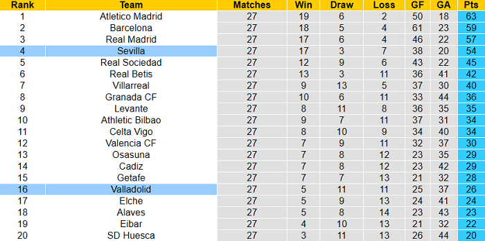 Sevilla là một trong 4 đội có thành tích tốt nhất La Liga 2020/21. Họ giành 54 điểm sau 27 vòng và hơn tới 9 điểm so với đội xếp thứ 5 là Real Sociedad.