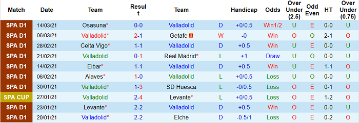 - Thống kê 10 trận gần nhất của Valladolid