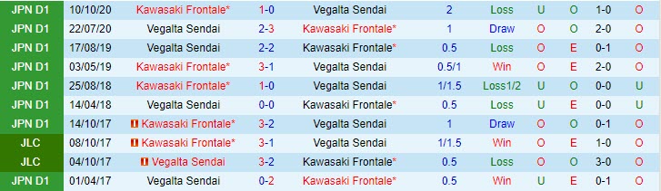 Phong độ và thống kê đối đầu Vegalta Sendai - Kawasaki Frontale gần đây: