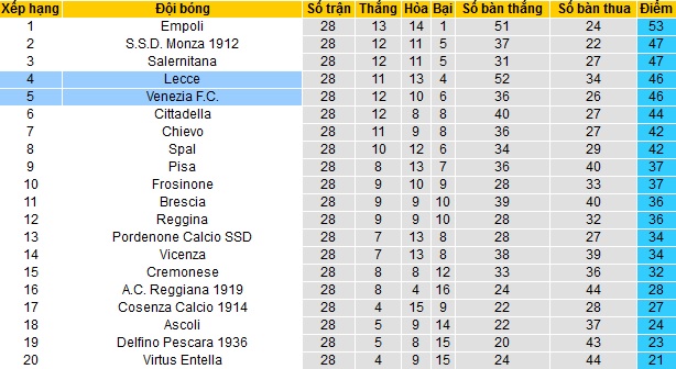 Sau 28 vòng đấu, cả Venezia và Lecce cùng có được 46 điểm và đang đứng sát nhau trên bảng xếp hạng trong nhóm các đội có suất dự vòng play-off tranh vé vớt thăng hạng. Tuy nhiên Lecce đang tạm xếp trên khi đứng ở vị trí thứ 5 do hơn về hiệu số bàn thắng (+18 so với +10).