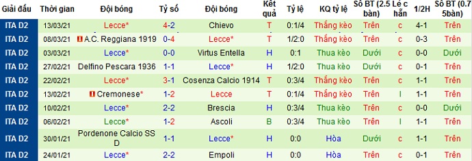 + Thống kê 10 trận gần nhất của Lecce