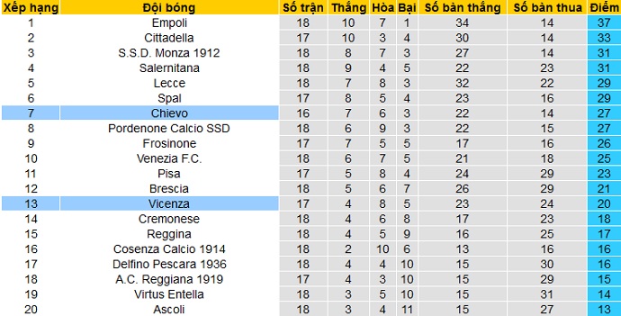 Trong khi đó Chievo đang nằm trong nhóm các đội có suất dự play-off tranh vé vớt thăng hạng ở vị trí thứ 7. Với 27 điểm có được sau 16 vòng đấu, Chievo đang bị các đội xếp ngay sau bám đuổi rất sát trong khi khoảng cách với 2 đội dẫn đầu đã lên tới 6 điểm.