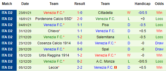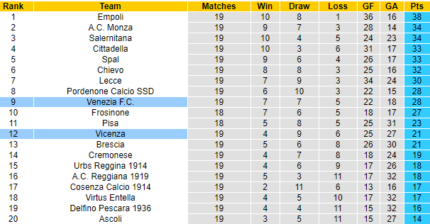 Phía đối diện, Venezia cũng không phải là cái tên sáng giá, và CLB này cũng chỉ hướng tới mục tiêu giành vị trí an toàn. Hiện Venezia xếp thứ 9 và hơn Vicenza tới 7 điểm. Về cơ bản, Venezia vẫn rộng cửa vươn lên nhóm cạnh tranh vé play-off thăng hạng.