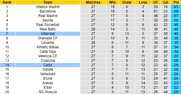 Điều đó cho thấy niềm tin của giới chuyên môn dành cho Villarreal là khá thấp. Trận đối đầu giai đoạn lượt đi La Liga mùa này, Cadiz đã cầm hòa Villarreal với tỷ số 0-0. Lượt về sắp tới đội bóng tân binh tiếp tục được tin tưởng vào khả năng có điểm khi đang có phong độ ổn định.