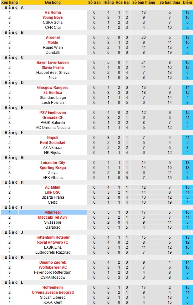 Bảng xếp hạng Europa League giai đoạn vòng bảng