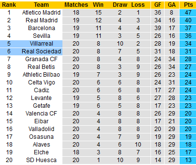 Villarreal đang đánh mất mình và dần rời xa nhóm có vé dự Champions League mùa sau. Vị tí thứ 5 sau 20 trận với 34 điểm, ít hơn tới 13 điểm và đá nhiều hơn 2 trận so với Atletico Madrid là khoảng cách quá lớn.