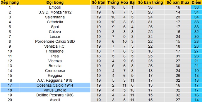 Cuộc chiến trụ hạng của các đội trong nhóm cuối bảng tại giải hạng nhì Italia đang trở nên quyết liệt hơn bao giờ hết. Sau 19 vòng đấu, cả Virtus Entella và Cosenza đều đang có được 17 điểm, đứng sát nhau trong nhóm các đội cuối bảng.