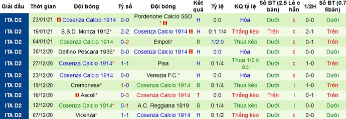 + Thống kê 10 trận gần nhất của Cosenza