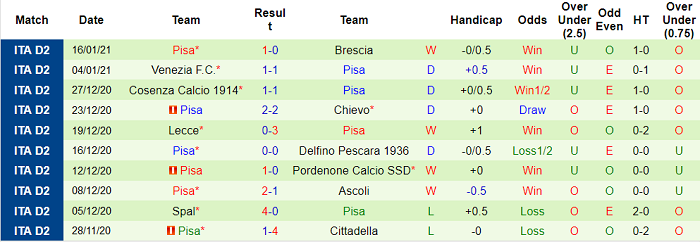 Thành tích sân khách của Pisa cũng không thực sự thuyết phục: không thắng 7/9 trận sân khách kể từ khi Serie B 2020/21 khởi tranh. Họ nhận 3 thất bại trong số 7 trận không thắng trên sân khách mùa này.