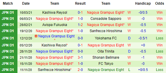 + Thống kê 10 trận gần nhất của Nagoya Grampus