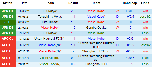 + Thống kê 10 trận gần nhất của Vissel Kobe