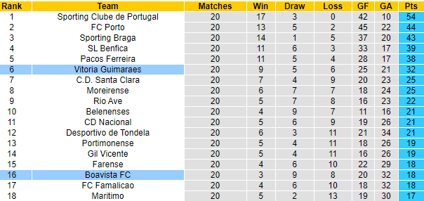 Nhưng dẫu sao Vitoria Guimaraes cũng đang an toàn, còn Boavista thì phải đối diện với khả năng xuống hạng. CLB này đang nằm trong nhóm cầm đèn đỏ với chỉ 18 điểm. Việc Boavista chơi không tốt từ đầu mùa chẳng làm ai bất ngờ, vì thực lực của họ bị đánh giá rất thấp.