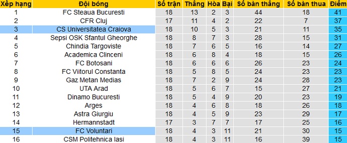 Bảng xếp hạng giải VĐQG Romania trước vòng 19