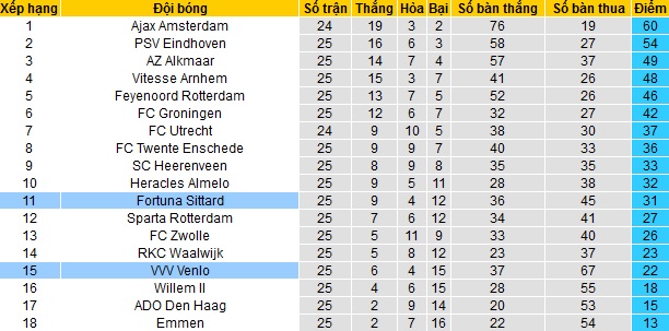 Trong khi đó Fortuna Sittard đang đứng thứ 11 trên bảng xếp hạng với 31 điểm cũng sau 25 vòng đấu. Mặc dù Fortuna Sittard vẫn đang ra sức bám đuổi nhưng khoảng cách của đến Top 7 gồm các đội có suất dự play-off vẫn đang là 6 điểm.