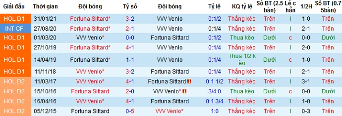+ Soi tỷ lệ kèo châu Á: Mặc dù được chơi trên sân nhà nhưng với phong độ kém cỏi nên VVV Venlo vẫn bị đánh giá là đội cửa dưới với kèo chấp đang là +0,25. Trong 5 lần đối đầu gần nhất giữa hai đội Fortuna Sittard vẫn đang chiếm ưu thế với 3 trận thắng và 2 trận hòa, tuy nhiên 3 chiến thắng họ có được đều trên sân nhà.