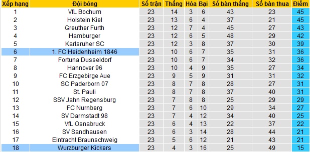 Trong khi đó Heidenheim đang đứng thứ 6 trên bảng xếp hạng với 36 điểm có được cũng sau 23 vòng đấu. Hiện khoảng cách của Heidenheim đến các đội Top 3 vẫn đang là 7 điểm, khá khó để có thể san lấp tuy giải vẫn đang còn 11 vòng đấu nữa.