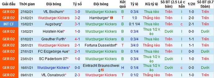 Sau 23 vòng đấu tại giải hạng nhì Đức, Würzburger Kickers vẫn đang vật lộn ở vị trí bét bảng xếp hạng khi mới có được 15 điểm. Hiện tại Würzburger Kickers đang còn kém 2 đội đứng ngay trên 6 điểm và cách nhóm trụ hạng tới 7 điểm.