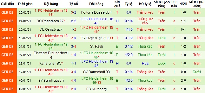 Trong 5 trận gần đây thành tích của Heidenheim là khá tốt với 3 trận thắng, 1 trận hòa và 1 trận thua. Thế nhưng thành tích sân khách của đội bóng có phần tệ hơn khi họ chỉ có được 1 trận thắng, 2 trận hòa và 2 trận thua sau 5 lần du đấu gần nhất.