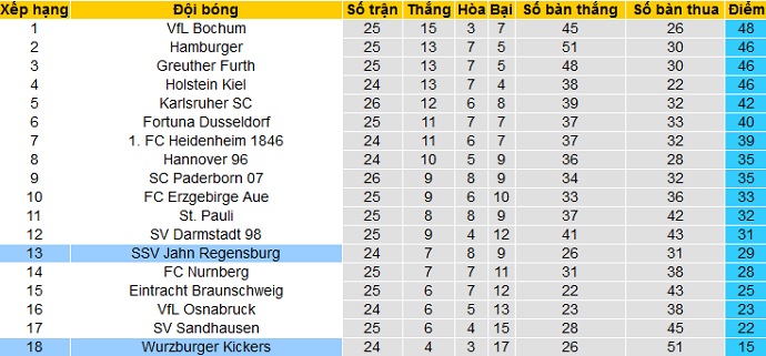 Trong khi đó Jahn Regensburg cũng chỉ đang đứng thứ 13 trên bảng xếp hạng. Với 29 điểm có được sau 24 vòng đấu, Jahn Regensburg đang còn hơn nhóm các đội cầm đèn đỏ 6 điểm nhưng thi đấu ít hơn so với 2 đội đứng ngay sau từ 1 đến 2 trận.