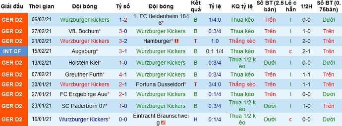 Trong 5 trận đấu gần đây Würzburger Kickers chỉ có được trận thắng đầy bất ngờ trước Hamburger, để thua ở cả 4 trận còn lại. Tuy nhiên thành tích sân nhà của đội bóng lại khá tốt khi có được 2 trận hòa và 2 trận thắng trước khi để thua 1-2 trước Heidenheim ở trận đấu gần nhất tại đây.