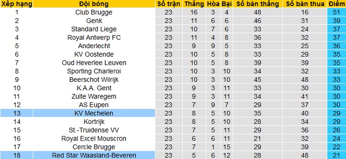 Trong khi đó Mechelen cũng chỉ đang đứng thứ 13 trên bảng xếp hạng với 29 điểm cũng sau 17 vòng đấu. Hiện Mechelen đang hơm nhóm các đội cuối bảng 7 điểm, nhưng cũng chỉ kém nhóm các đội có suất dự cúp châu Âu có 4 điểm.