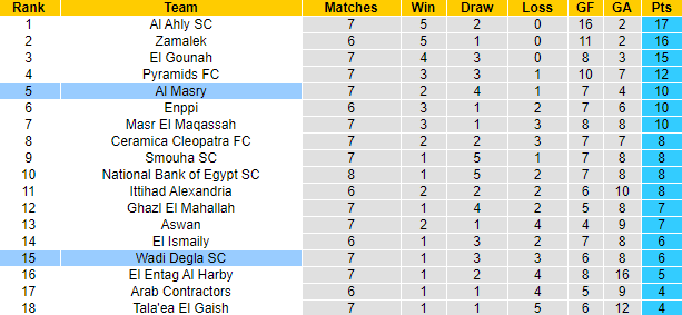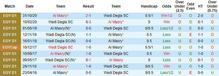 Trận tới đây Wadi Degla sẽ phải đối đầu Al Masry - đội bóng đã giành chiến thắng cả 2 lần chạm trán ở mùa giải trước. Xa hơn, trong vòng 17 trận đối đầu Wadi Degla trước đây tính trên mọi đấu trường, Al Masry bất bại 14 lần với 9 chiến thắng và 5 trận hòa.
