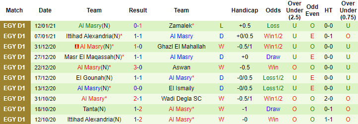 Al Masry luôn chơi rất tệ trên sân khách, 4 trận gần đây họ toàn thua mà không thể ghi nổi 1 bàn. Tuy nhiên khi thi đấu trên sân trung lập, Al Masry lại luôn có được sự tự tin giành kết quả thuận lợi. 12 trận liên tiếp vừa qua đá ở sân trung lập, Al Masry bất bại tới 11 lần với 7 chiến thắng và 4 trận hòa.