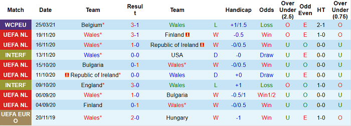 - Thống kê 10 trận gần nhất của Wales