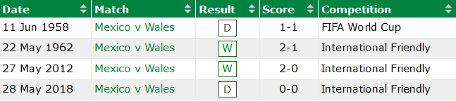 Nhìn lại lịch sử, Mexico luôn biết cách ‘gây khó dễ’ cho Wales. Bằng chứng: Mexico bất bại cả 4 lần so tài trước đây với Wales (thắng 2, hòa 2).