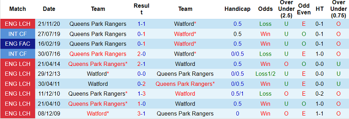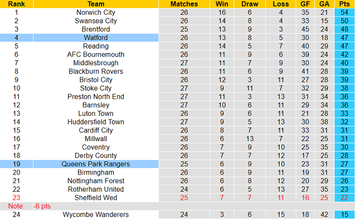Phong độ và thống kê đối đầu Watford - QPR
