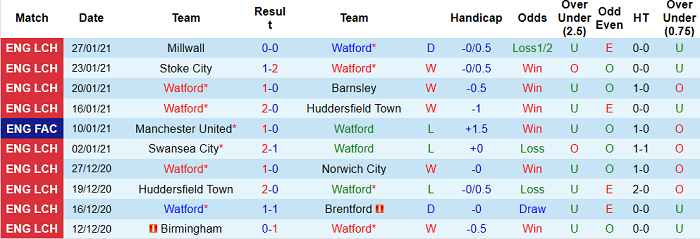 - Thống kê 10 trận gần nhất của Watford