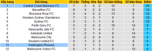 Trong khi đó Central Coast Mariners đã vươn lên dẫn đầu bảng xếp hạng với 15 điểm sau 7 vòng đấu,hơn đội nhì bảng Macarthur 1 điểm nhưng còn đang thi đấu ít hơn 1 trận. Dù sao đây cũng là thành tích rất ấn tương khi so với vị trí bét bảng của Central Coast Mariners ở mùa giải trước.