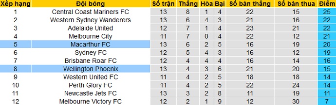 Wellington Phoenix hiện tại đã vươn lên vị trí thứ 8 trên bảng xếp hạng của giải VĐQG Úc với 15 điểm có được sau 13 vòng đấu. Tuy nhiên hiện tại đội bóng vẫn còn đang kém Top 6 tới 4 điểm trong khi đã thi đấu nhiều hơn 1 trận.
