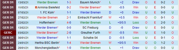 + Thống kê 10 trận gần nhất của Werder Bremen