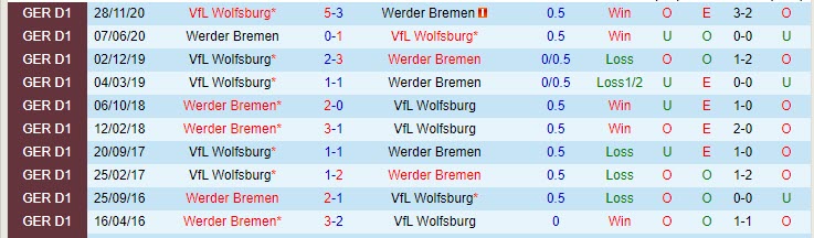 Phong độ và thống kê đối đầu Werder Bremen - Wolfsburg gần đây: