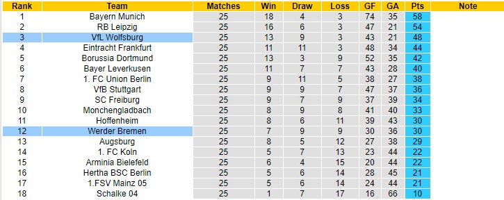 Tất nhiên, đây chưa phải khoảng cách an toàn bởi giải VĐQG Đức vẫn còn tới 9 vòng đấu nữa mới khép lại. Để bảo toàn vị trí hiện tại, Werder Bremen sẽ phải nỗ lực tích lũy điểm số và trước mắt sẽ là nhiệm vụ có điểm ở trận tiếp đón Wolfsburg.